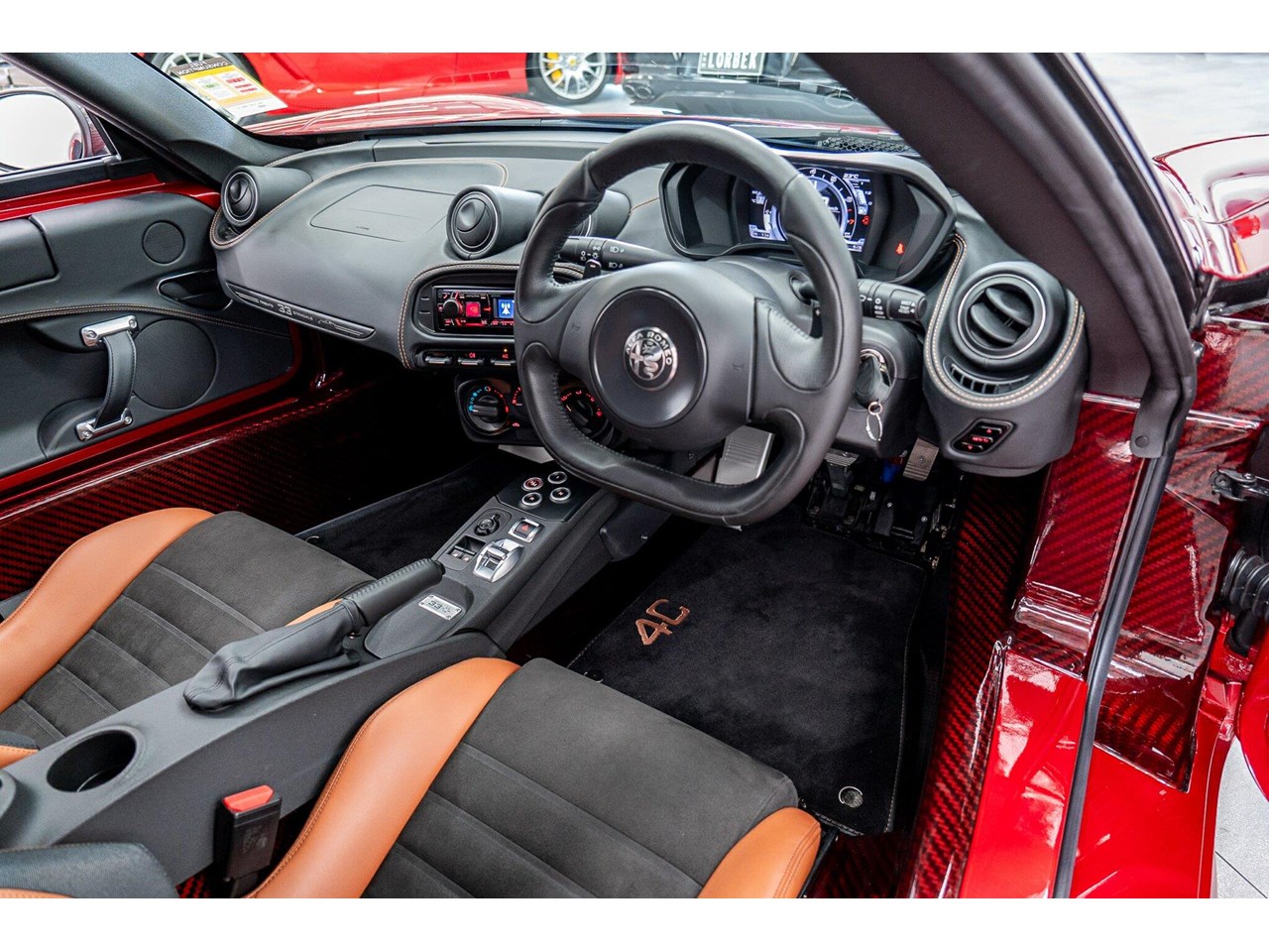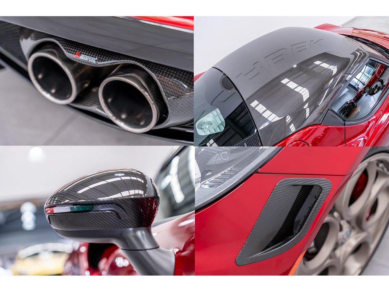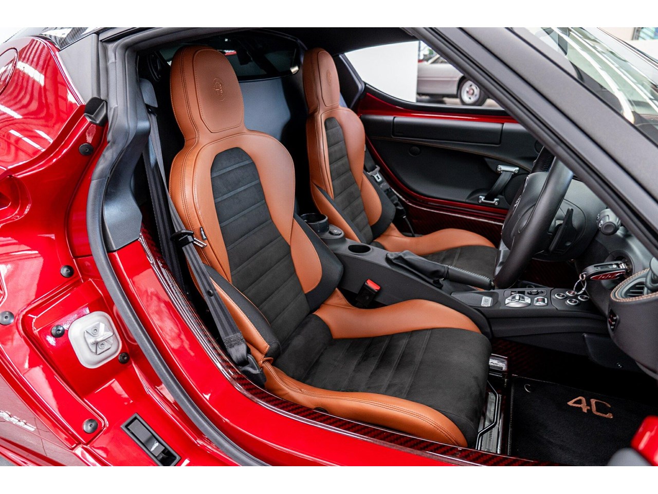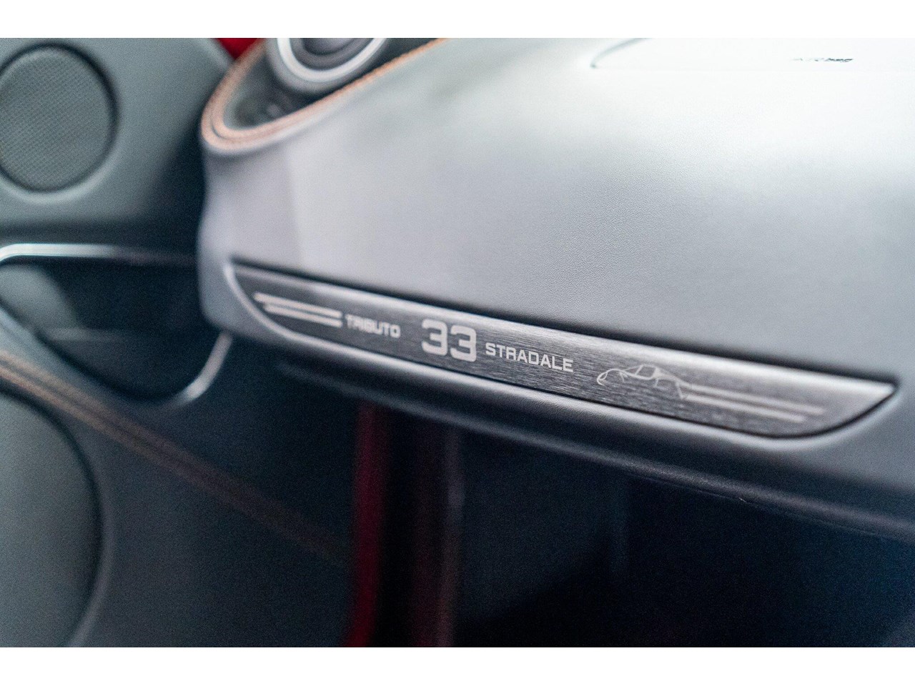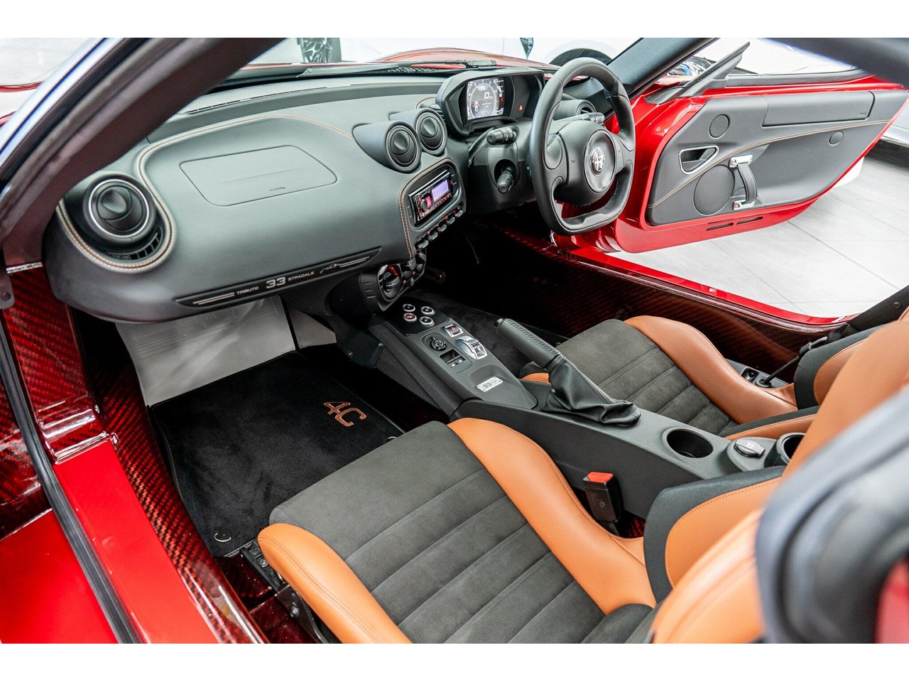 Compared to the ?standard? 4C, the Tributo adds heritage-inspired styling : exclusive distinctive Rosso Villa d?Este tri-coat red paint, grey-gold five-hole alloy wheels, and carbon-fibre mirror caps with the Italian flag, carbon-fibre roof and interior badging/plaques referencing the 33 Stradale.