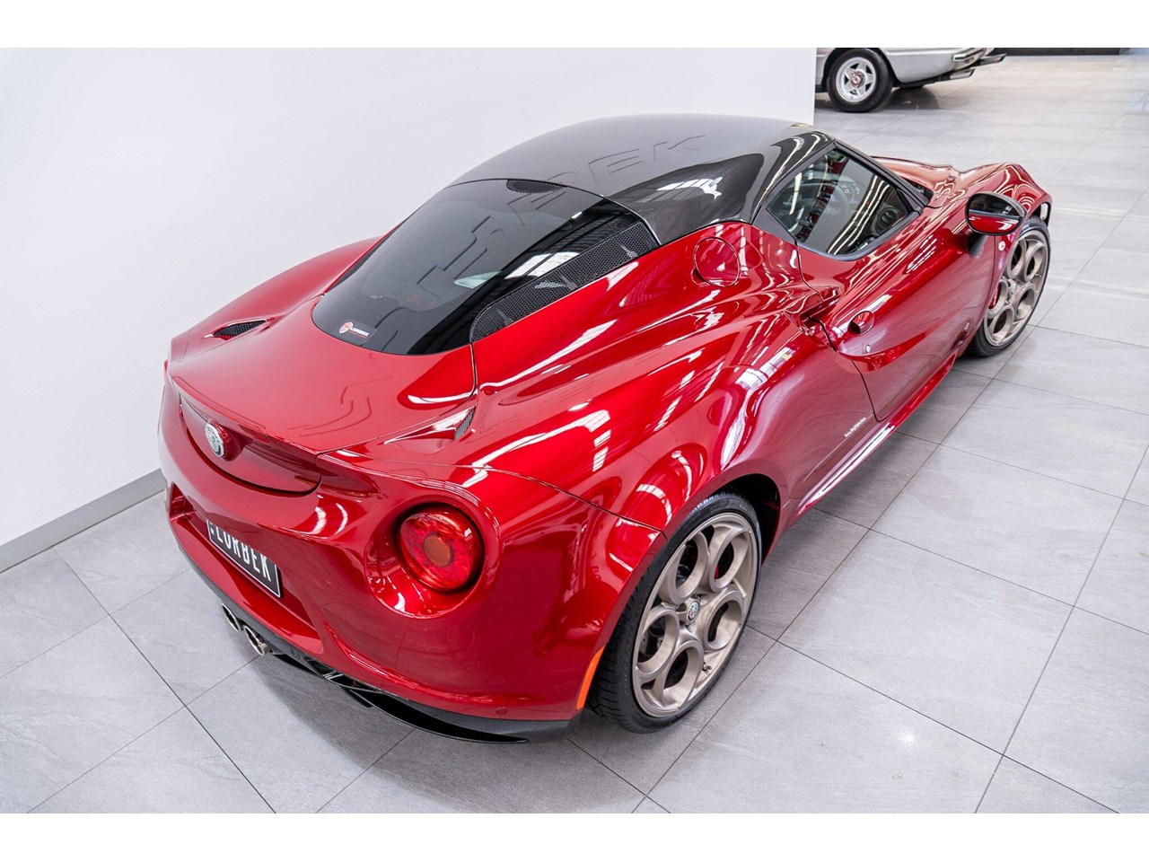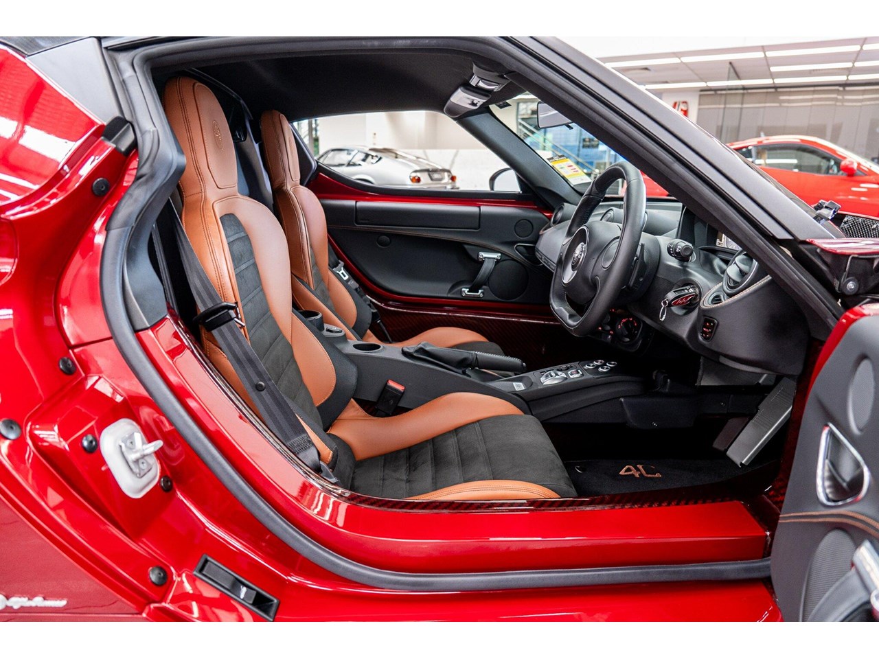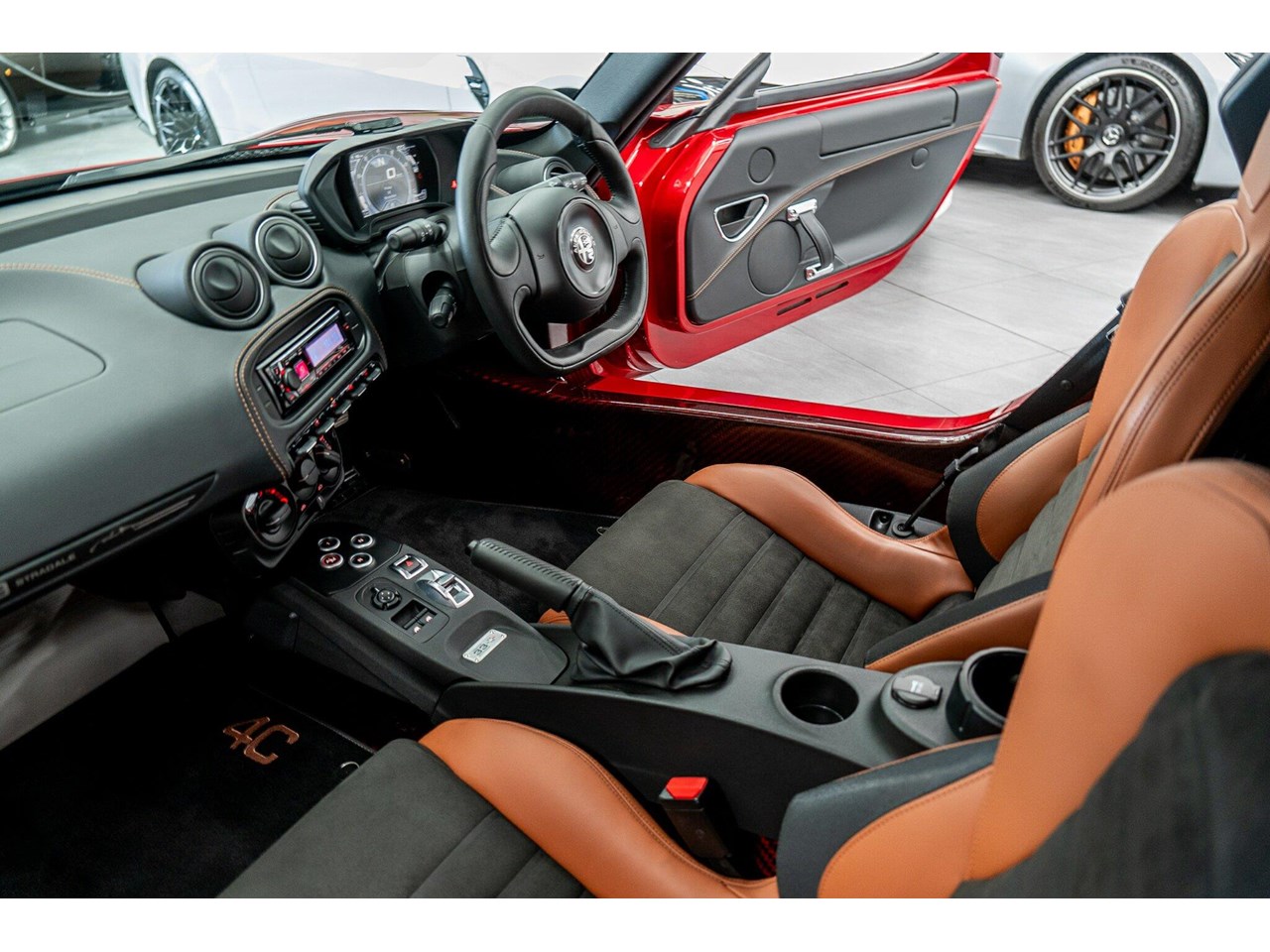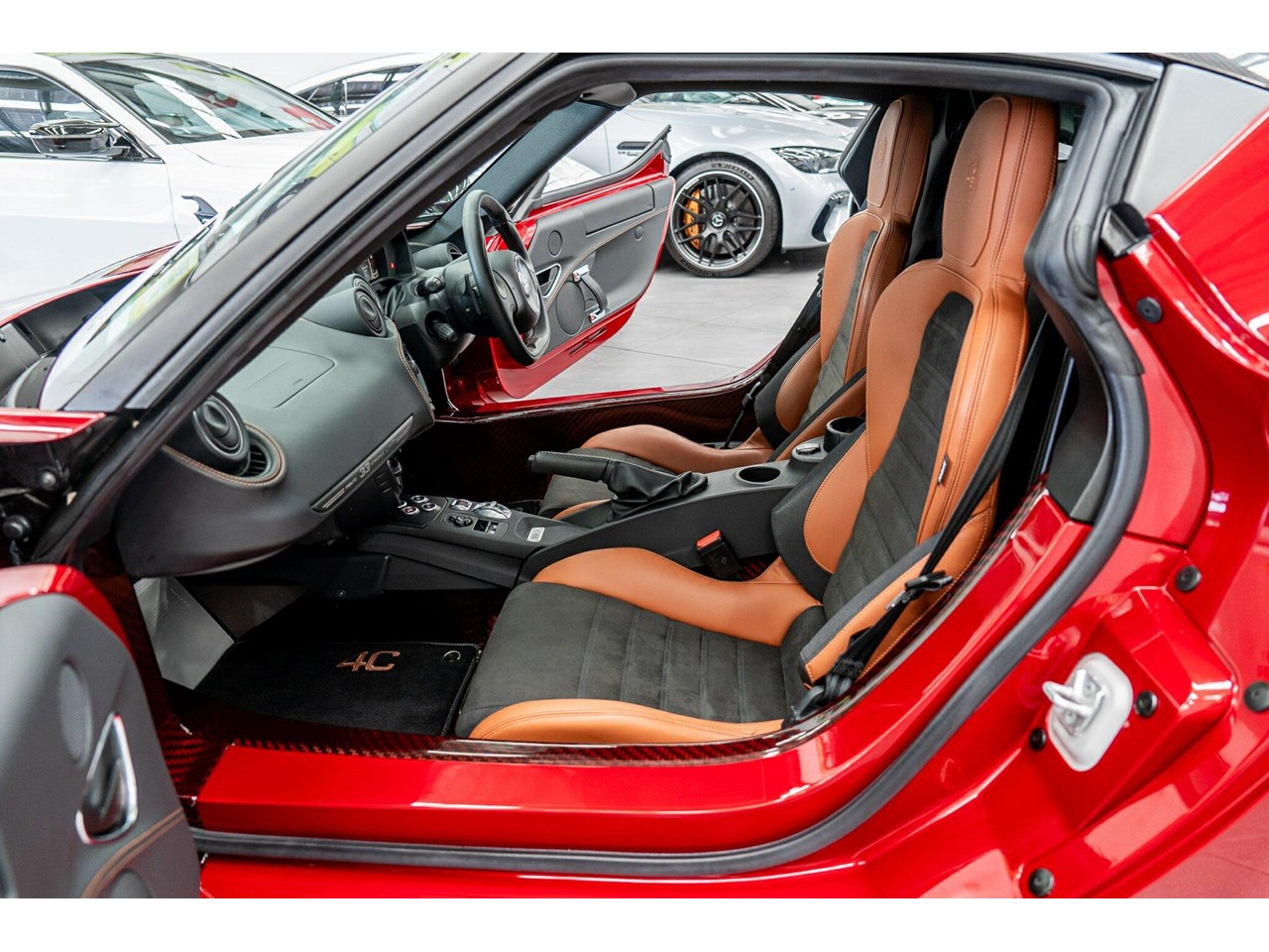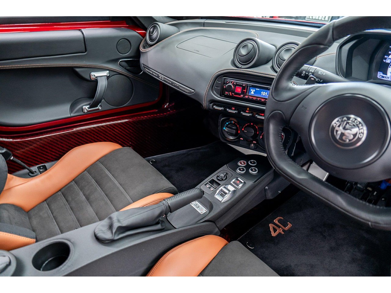 Compared to the ?standard? 4C, the Tributo adds heritage-inspired styling : exclusive distinctive Rosso Villa d?Este tri-coat red paint, grey-gold five-hole alloy wheels, and carbon-fibre mirror caps with the Italian flag, carbon-fibre roof and interior badging/plaques referencing the 33 Stradale.