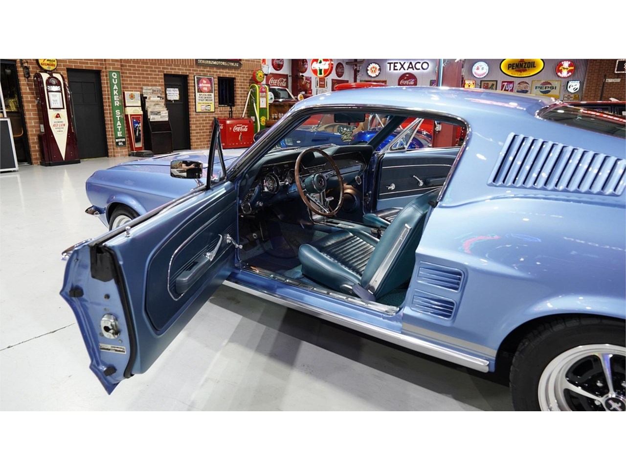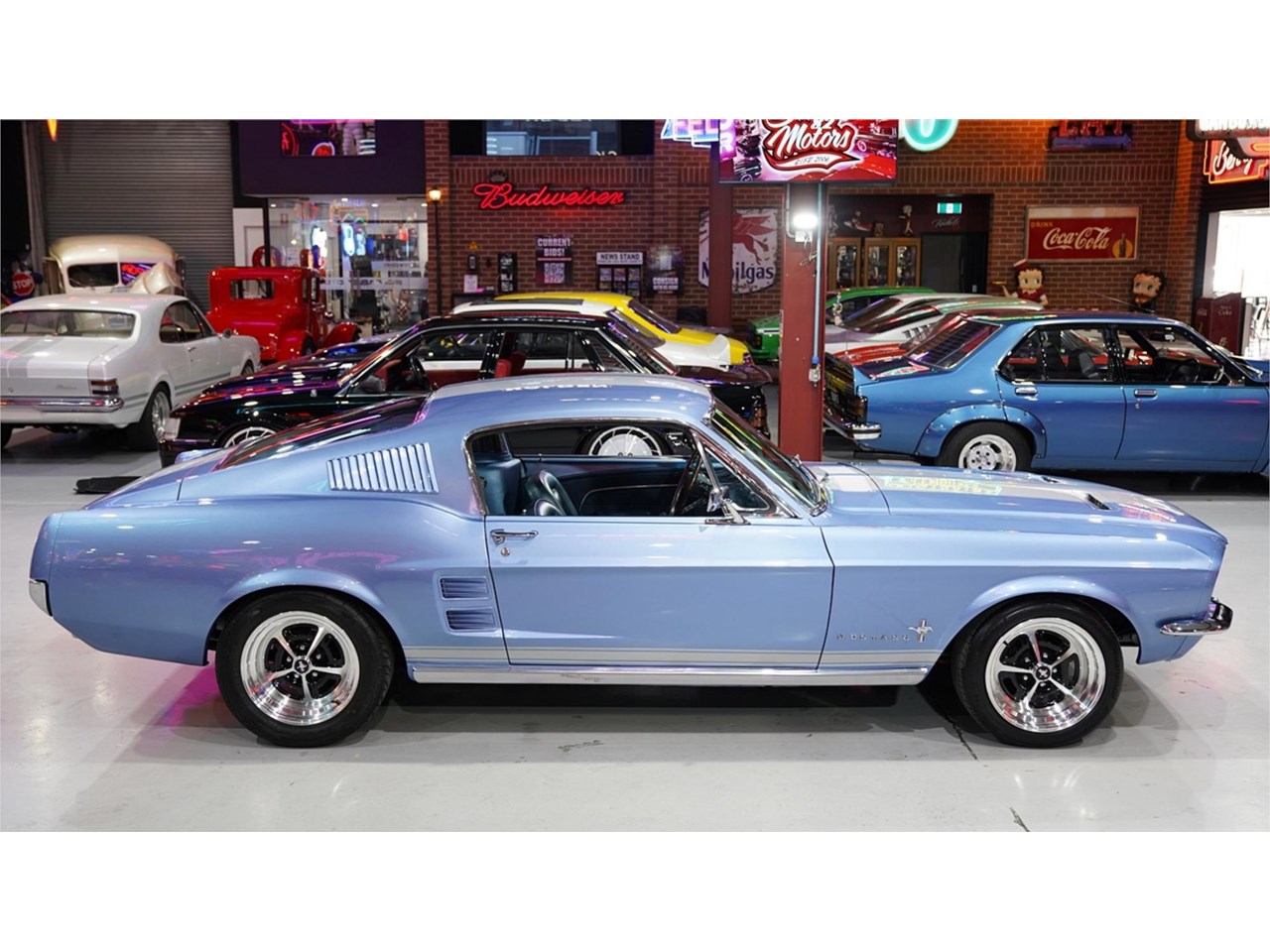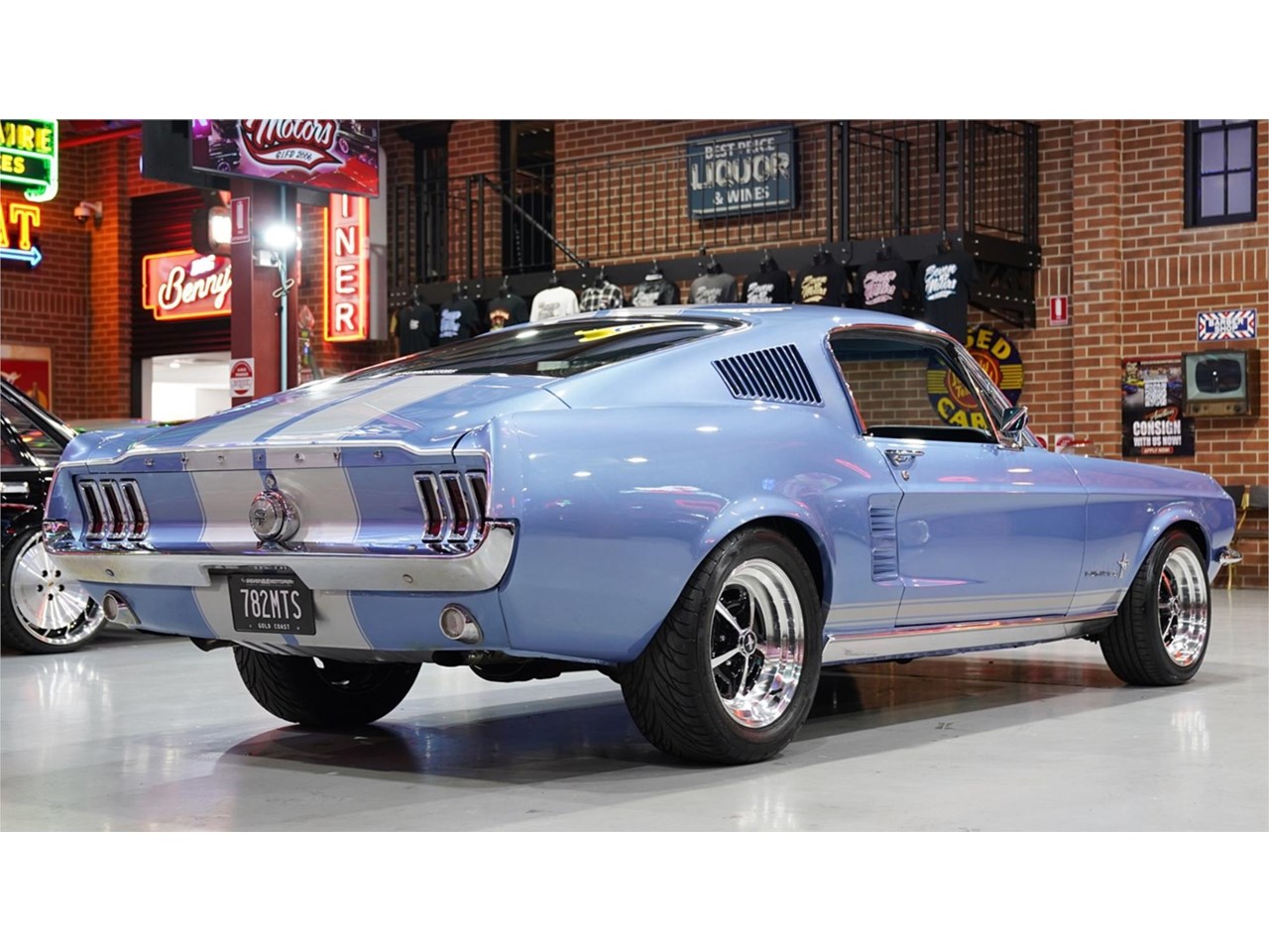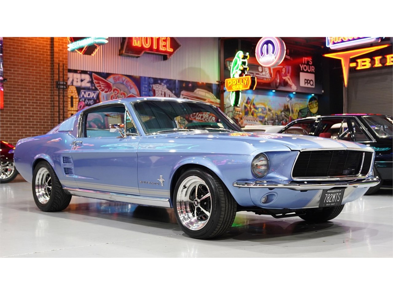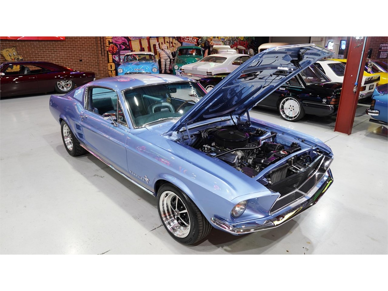HIGHLIGHTS: - Rotisserie restored '67 Mustang Fastback - Repainted in Brittany Blue with silver stripes - Refinished factory style interior trim with console - Blueprinted and balanced 347ci Stroker with alloy heads - Built C4 automatic with heavy duty billet internals, manual valve body and 3,500 rpm stall - Nine-inch diff with 3.55 ratio and 31 spline axles - Factory air conditioning - Power steering - Power disc brake front end - Viking adjustable coil over front end - 16" Magnum 500 style wheels